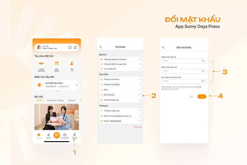 Thông tin cá nhân, mật khẩu cùng hợp đồng đăng ký các gói học piano được app Sunny Days Piano lưu trữ cá nhân hoá, đảm bảo tính bảo mật, giúp học viên kiểm soát thời hạn cùng các điều khoản hợp đồng tiện lợi hơn. Một số vấn đề liên quan đến mật khẩu, học viên có thể tham khảo các trường hợp sau đây: