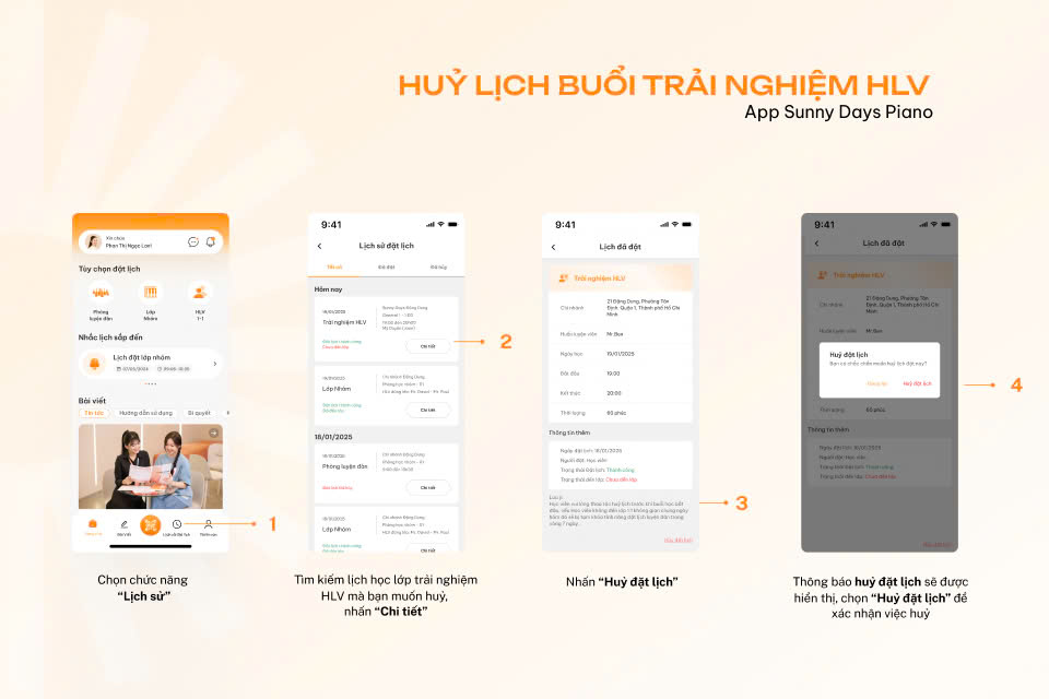 Cách huỷ lịch đặt lịch học lớp Trải nghiệm HLV app Sunny Days Piano