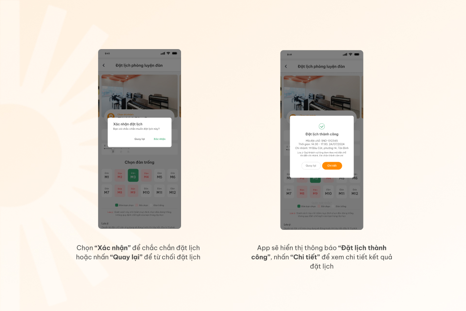 - Bước 5: Ứng dụng sẽ hiển thị thông báo xác nhận, bạn hãy chọn “Xác nhận” để chắc chắn đặt lịch thành công, nhấn “Quay lại” để từ chối đặt lịch. Khi đã đặt lịch thành công, app Sunny Days Piano sẽ hiển thị thông báo “Đặt lịch thành công”.
