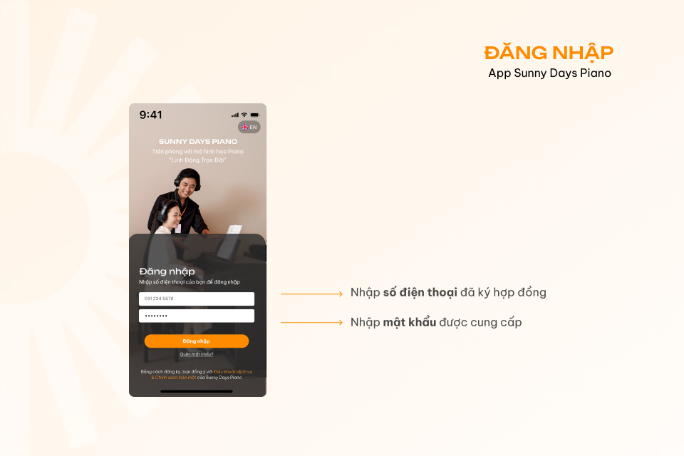 Học viên sau khi ký hợp đồng thành công sẽ được Sunny Days Piano cung cấp tài khoản và mật khẩu thông qua số điện thoại. Để đăng nhập vào app, bạn chỉ cần: